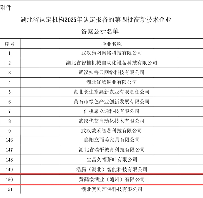 近日,湖北省认定机构发布《关于对2025年认定报备的第四批高新技术企业进行备案的公示》,黄鹤楼酒业(随州)有限公司成功入选第四批高新技术企业备案公示名单。